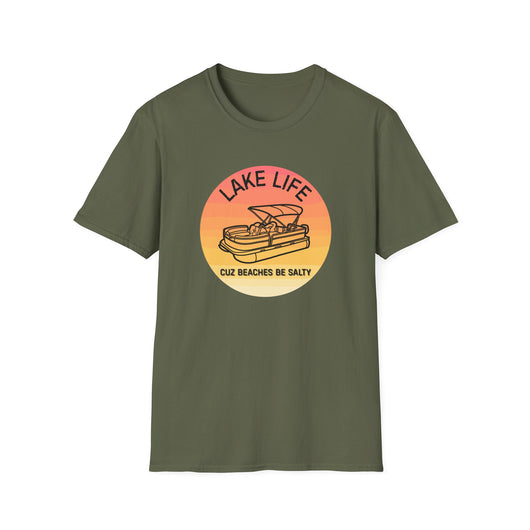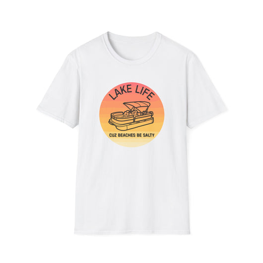 Sunset-soft and easygoing, this lightweight tee brings lake afternoons into your everyday rotation. A warm, retro sunset circle frames a laid-back pontoon sketch and the cheeky line “Cuz beaches be salty,” so it reads like a little inside joke for anyone who prefers freshwater slow days over crowded shores. The clean crew neckline and classic fit let the print sit naturally across the chest — wear it with cutoff shorts after a paddle, layered under a flannel for dusk bonfires, or tossed on for road trips to the cabin. It settles in comfortably and looks like something you’ve loved for years from the moment you put it on.