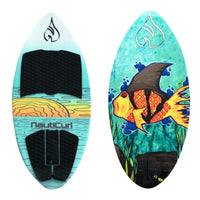 The Goldfish with a Shark bite. The NautiCurl Goldie is the perfect Grom board for your beginner to advanced rider. Expertly designed for stability for the beginner, but responds to allow pop for shuvs and spins and your child progresses. Premium E-glass construction with an overall 3/4 inch depth. Equipped with three reconfigurable fins in the rear, the NautiCurl Goldie delivers!