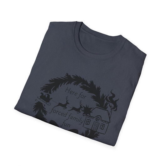A soft, breathable tee that carries a wry, holiday-humor design—hand-drawn wreath framing a chaotic sleigh and cottage scene with the cheeky line “Here for forced family fun.” Lightweight and smooth against the skin, it layers easily under sweaters or wears alone for low-key gatherings. The muted grey lets the black print stand out without shouting; the crew neckline and classic fit keep the look timeless while the tear-away label keeps it comfortable for long visits and travel. This shirt feels like a wink to anyone who knows the push-and-pull of seasonal family time—playful, honest, and made to be worn again and again.