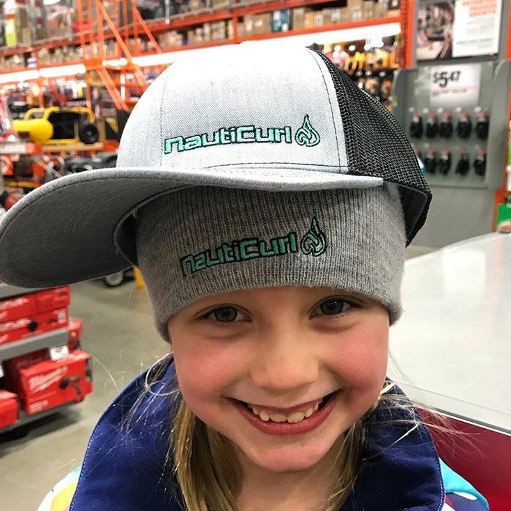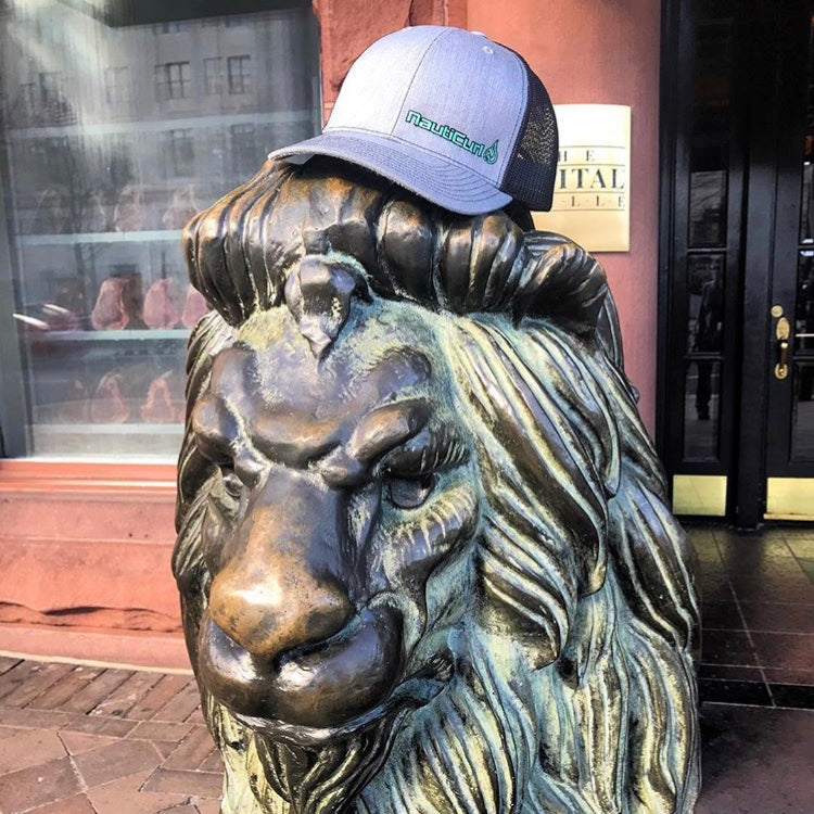 NautiGray and Black Snap Back, Custom Embroidered with our Infamous Turquoise NautiCurl Drop Logo. See why the Richardson Mesh Hat owns the market.