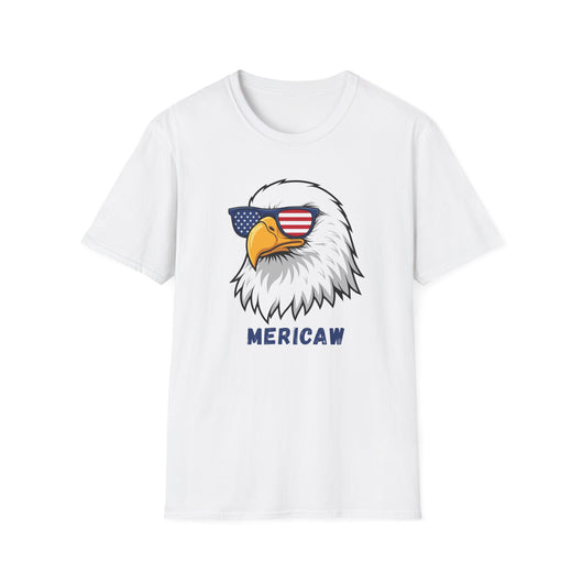 A light, comfortable tee crafted for those who like their Americana with a wink. The soft ring‑spun cotton sits easy against the skin while the crisp print — a confident eagle wearing star‑spangled shades and the playful “MERICAW” text — adds a cheeky, patriotic edge. Wear it to backyard barbecues, neighborhood parades, or casual Fridays when you want to be relaxed but still make a statement. The tubular knit and reinforced shoulder tape keep the fit clean, and the tear‑away label means no irritation. It drapes like a favorite old shirt from the first wear, but with fresh, durable printing that holds up wash after wash.